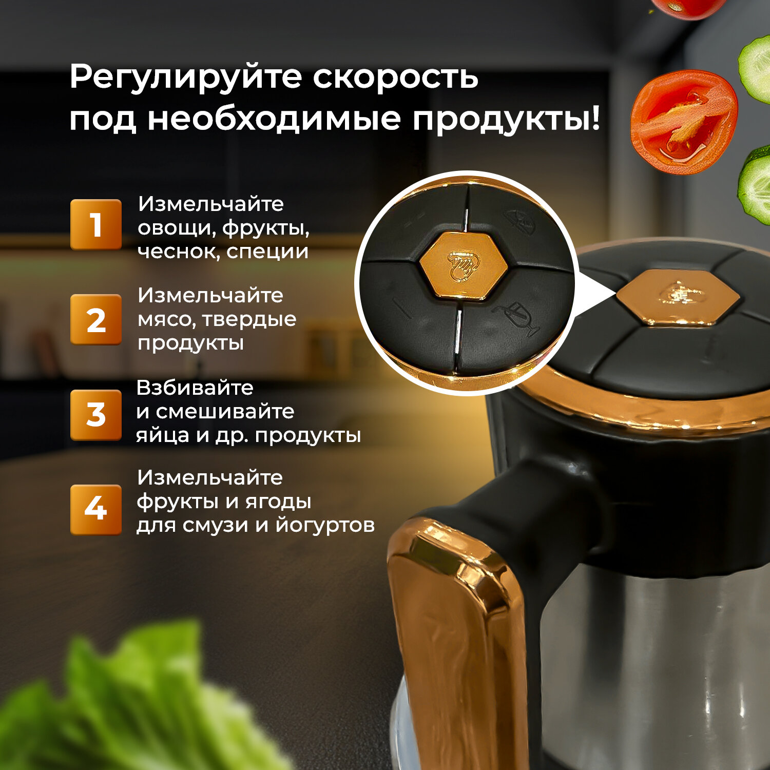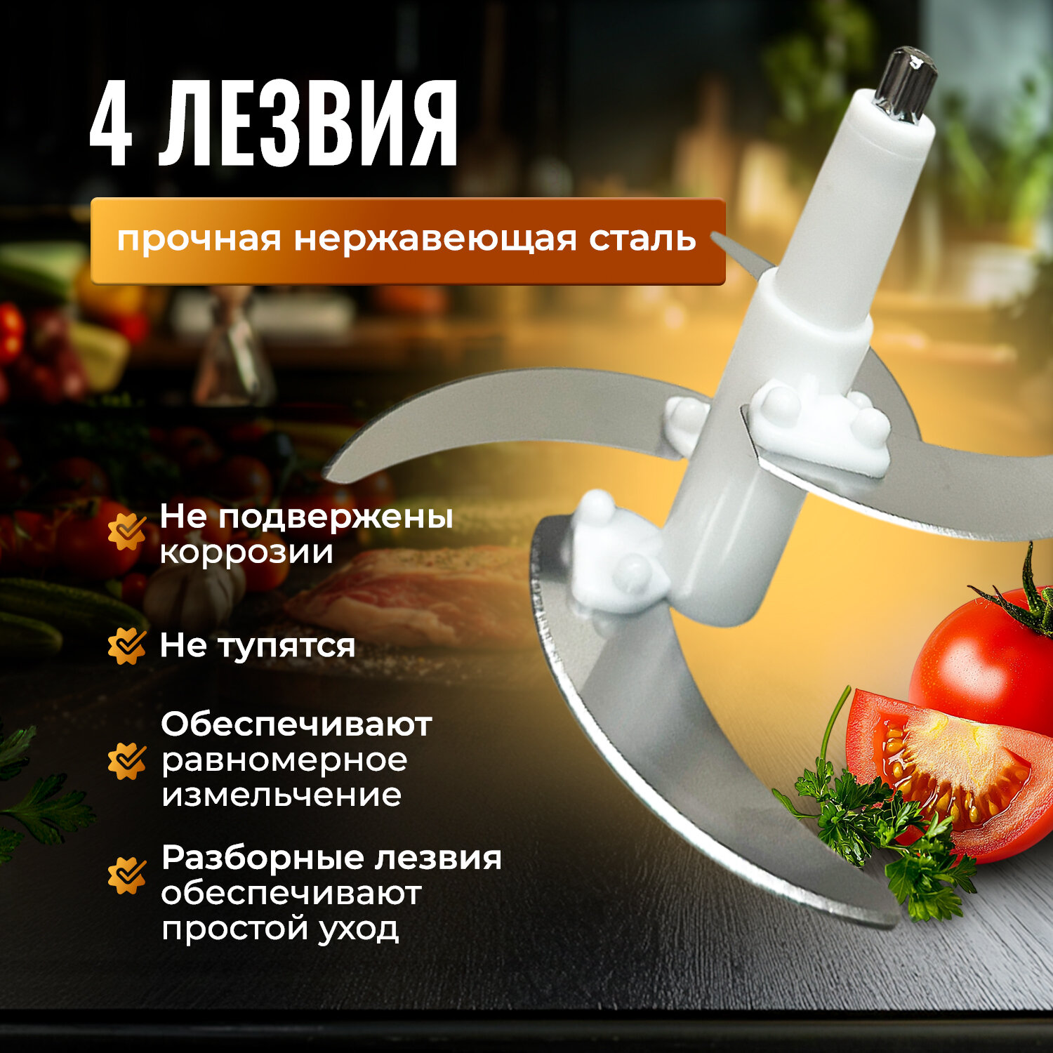 | Подробная комплектация | корпус управления, крышка, 4 разборных лезвия, защитные насадки на лезвия, чаша объемом 2.5 л, кольцо против скольжения |
