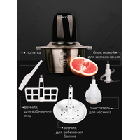 | Подробная комплектация | Измельчитель - 1 шт., нож из нержавеющей стали - 4 шт., очиститель чеснока - 1 шт., венчик для яиц - 1 шт., венчик для взбивания белков - 1 шт., пластиковая лопатка - 1 шт., инструкция по эксплуатации, подарочная упаковка с ручкой |