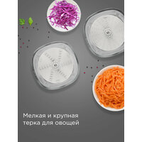 Измельчитель редмонд CR2700 быстро обработает мясо для нежного фарша, грецкие орехи для украшения торта и чеснок для маринада. В комплект входит мелкая и крупная терка, а также фирменная насадка для соуса. Они помогут за пару минут приготовить салат или сальсу. Прослужит долго: защита от перегрузки гарантирует надежность устройства.