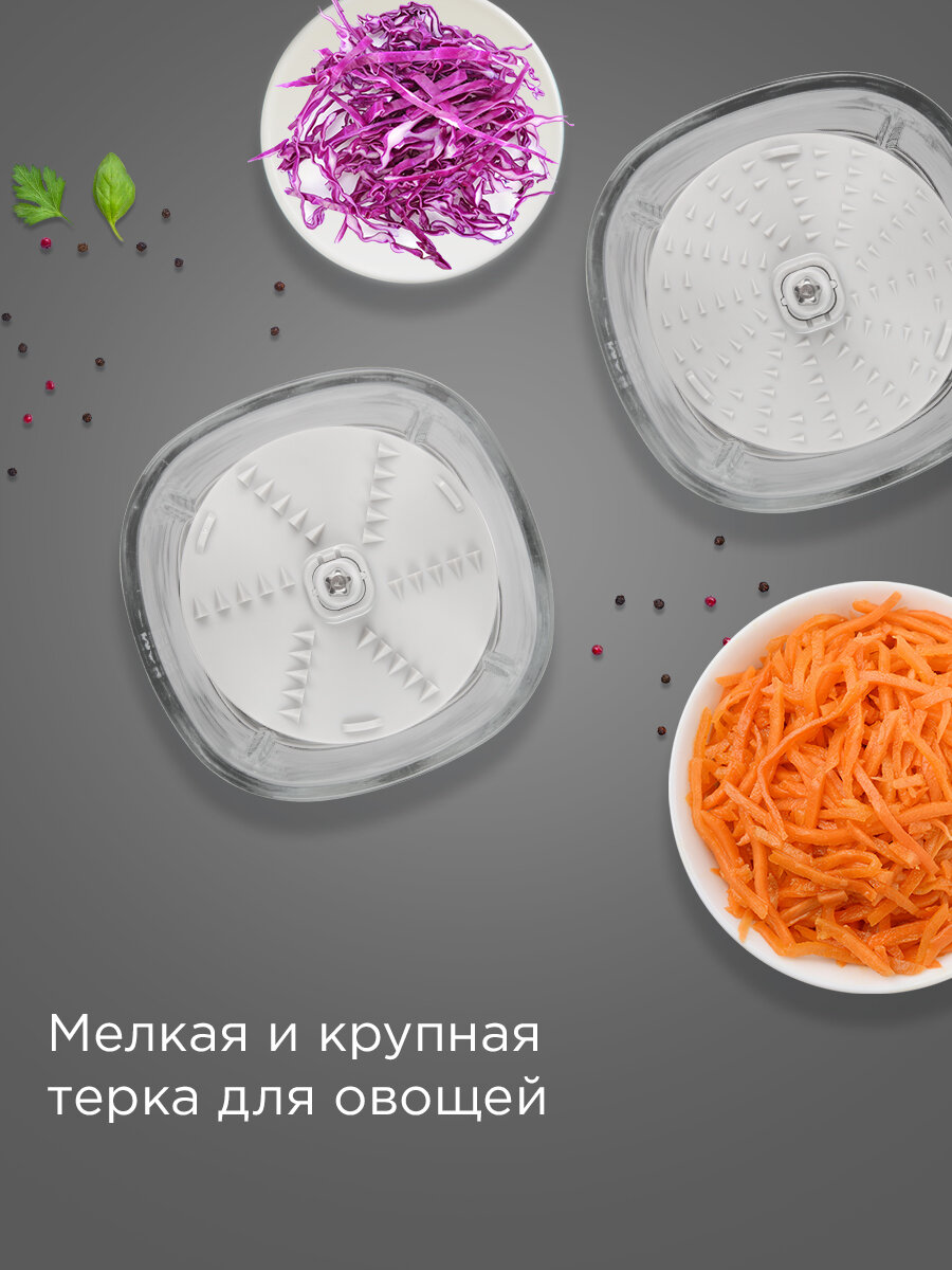 Избавьте себя от утомительной нарезки овощей для праздничных блюд. Крупная и мелкая терка помогут измельчить лук и морковь для супа, сыр для пиццы и яблоки для пирогов. Всего за несколько минут вы получите идеально нарезанные ингредиенты.