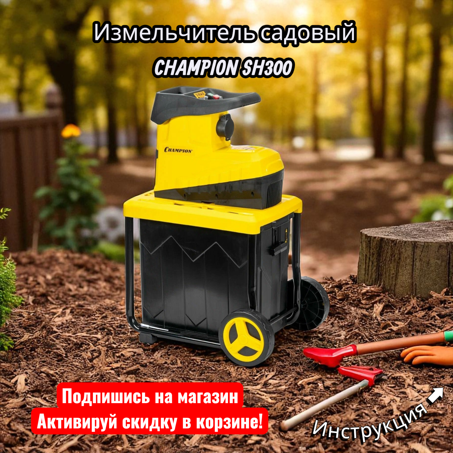 Измельчитель садовый CHAMPION SH300, 3.0 кВт, асинхронный двигатель, защита от перегрузки: сравнение цен, характеристики, фото, актуальное наличие и цены.