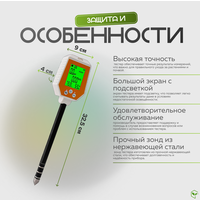 Датчик почвы модернизирован до интегрированной конструкции из высококачественной нержавеющей стали. Более прочный зонд позволяет избежать повреждения или коррозии тестера почвы. Тестер почвы оснащён большим экраном с подсветкой, который может отображать 6 измерений одновременно. Чтение очень удобно по сравнению с аналоговыми экранами или считывателями полос. Тестер почвы VitaFerma сделает вашу работу проще и удобнее.