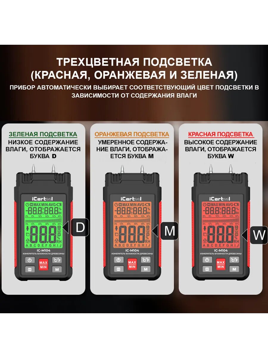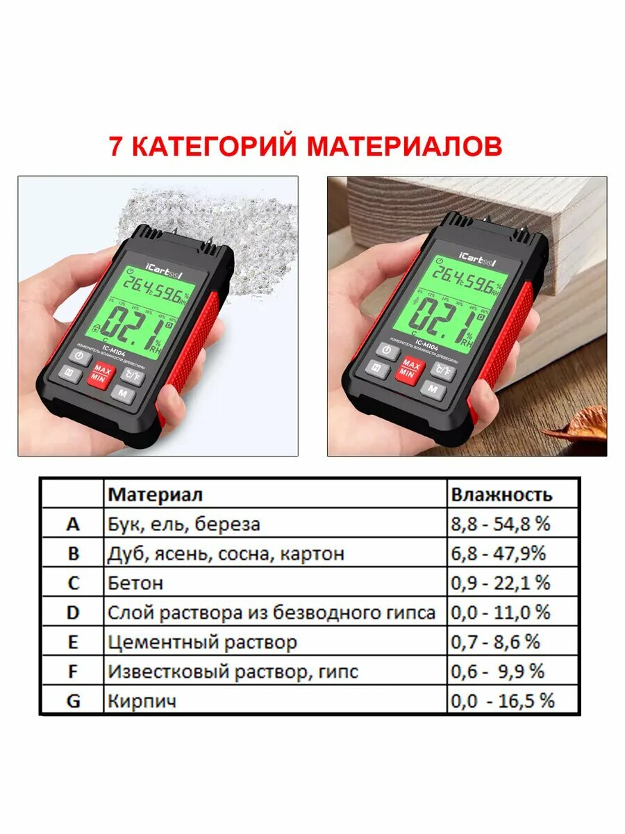 Измеритель влажности iCartool IC-M104 — это современный инструмент, предназначенный для точного определения уровня влажности в различных материалах и средах. Применимый в строительной, сельскохозяйственной и других отраслях, он позволяет быстро и точно оценивать условия, влияющие на качество и безопасность продукции либо конструкций. - Высокая точность: обеспечивает надёжные данные о содержании влаги, что важно для контроля качества и долговечности материалов. - Удобство использования: интуитивно понятный интерфейс с легко читаемым дисплеем упрощает проведение измерений даже для пользователей без специальной подготовки. - Портативный дизайн: компактность и малый вес делают его удобным для использования на выезде и в полевых условиях. - Широкий спектр применения: подходит для работы с древесиной, строительными материалами и другими веществами, где необходим контроль влажности для поддержания оптимальных условий эксплуатации и хранения. Измеритель влажности iCartool IC-M104 является отличным выбором для профессионалов, которые нуждаются в точных данных о влажности для поддержания стандартизированных условий работы и производства. Функциональные возможности: Измерение влажности материалов в диапазоне 0% – 57% Выбор категории материала: 328 типов материалов в памяти влагомера разделены на 7 групп (различные породы дерева, цементные стяжки, гипсовые штукатурки, растворы, бетоны) что повышает точность замера Трехцветная подсветка дисплея (красная, оранжевая и зеленая): Красная – высокое содержание влаги – маркер W Оранжевая – умеренное содержание влаги – маркер M Зеленая – низкое содержание влаги – маркер D Прибор автоматически выбирает соответствующий цвет подсветки в зависимости от содержания влаги в заданном материале. Измерение максимального и минимального значений Стоп кадр - сохранение данных на экране Характеристики: Количество и напряжение элементов питания 3х1.5B Элементы питания AAA/мизинчиковая(R03; LR03; FR03) Внесен в госреестр нет Поверка нет Комнатный есть Измерение древесина/бетон/гипс/цемент/кирпич Возможность измерения температуры воздуха да Диапазон измерения влажности (древесина) 0 - 57 % Диапазон измерения температуры воздуха от -20 до +60 °С Диапазон измерения влажности (стройматериалы) 0 - 23 % Диапазон измерения влажности (воздух) 0 - 99.9 % Измерение влажности почвы нет Выносной датчик измерения температуры и влажности нет Min абсолютная погрешность 2 % Измерение влажности бетона да Измерение влажности воздуха да Измерение влажности древесины да