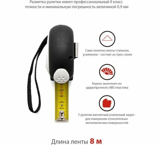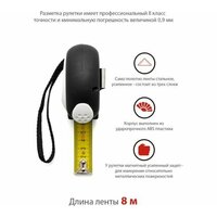 Рулетка с автоматическим стопором 8мх25мм Vira 100045 - это исключительно простой в эксплуатации инструмент, который пригодится как специалистам (столярам, строителям и т. д.), так и обычным пользователям. Модель обладает небольшими размерами и низким весом, что в совокупности с наличием специального крепления для пояса и удобного ремешка обеспечивает комфорт при её транспортировке от одной рабочей точки к другой. Благодаря автоматическому стопору обеспечивается полный контроль над процессом измерения. Материал корпуса (ABS-пластик с резиновыми вставками) и мерного полотна обеспечивают рулетке продолжительный рабочий ресурс. Увеличенная толщина ленты предотвращает её излом во время измерений.