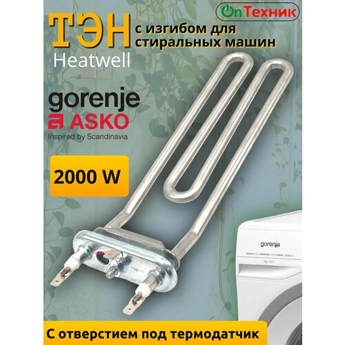 ТЭН для стиральной машины Gorenje, ТЭН Asko 2000 Вт, нагревательный элемент 824926, заменить ТЭН 513024, ТЭН с отверстием под термодатчик, трубчатый нагреватель Heatwell, купить ТЭН для стиральной машины, водяной ТЭН 2000W 230V, 00201707