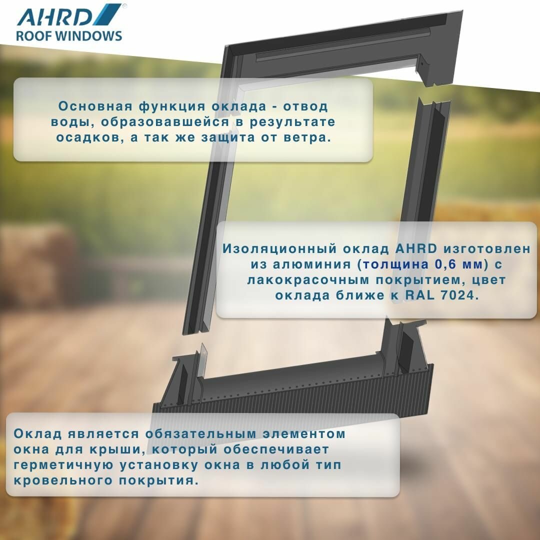 Изоляционные оклады AHRD изготовлены из алюминия (толщина 0,6 мм) с лакокрасочным покрытием, цвет оклада ближе к RAL 7024 • Оклад AHRD S для плоских кровельных материалов; • Оклад AHRD Z для профилированных кровельных материалов с высотой профиля до 10 см.