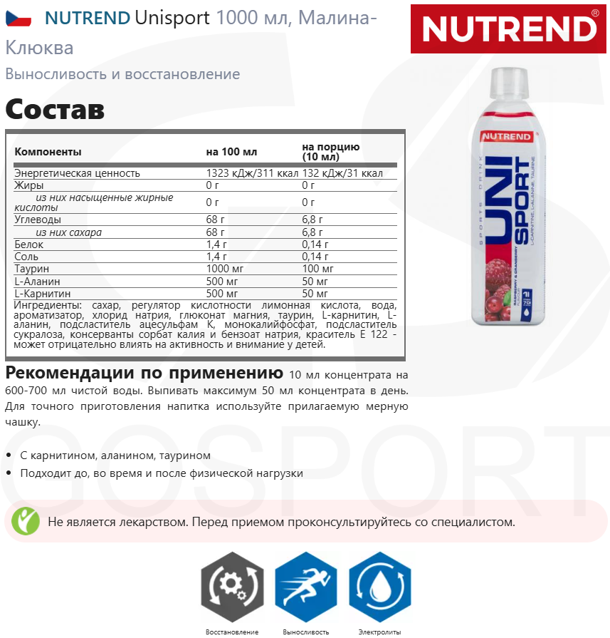 NUTREND Unisport 1000 мл, Малина-Клюква: сравнение цен, характеристики, фото, актуальное наличие и цены.