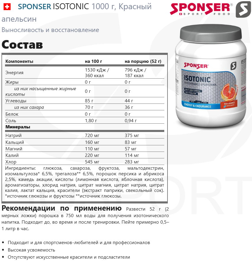 Профессиональный изотонический напиток - утолитель жажды, компенсирующий потери микроэлементов при гипернагрузках, содержит важные электролитические минералы и витамины. Комбинация различных типов Сахаров повышает энергетическое значение на 20-50% по сравнению со спортивными напитками, содержащими только один тип сахара (например, Jentjens, Med Sci Sport Exerc 2004). С Изотоником от Sponser организм усваивает жидкость, минералы и витамины гораздо быстрее. Применяется до, во время и после спортивных занятий. Легко усваивается и имеет очень приятный фруктовый вкус.
