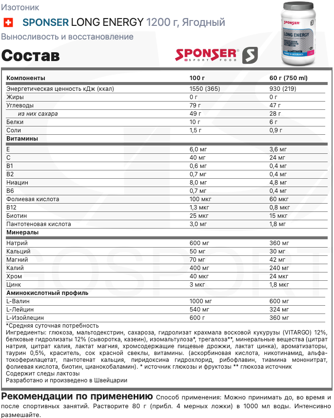 Способ применения: Можно принимать до, во время и после спортивных занятий. Растворите 80 г (прибл. 4 мерных ложки) в 1000 мл воды. Интенсивно размешайте.
