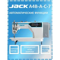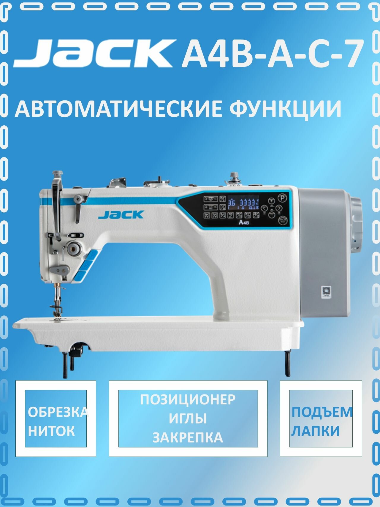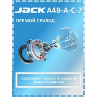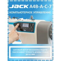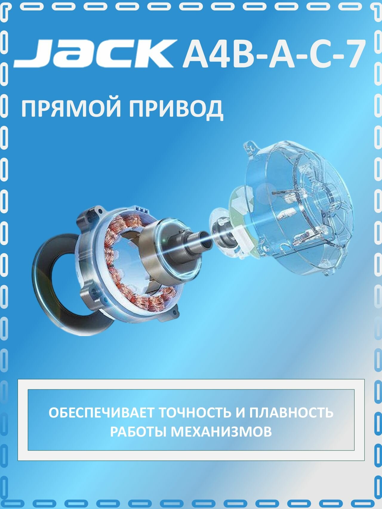 Прямострочная машина JACK А4В-А-С с автоматическими функциями обрезки ниток, подъема лапки, закрепки, нитеулавливателя и позиционера иглы и встроенным сервоприводом. С шаговым мотором, управляющим прямым и обратным ходом.