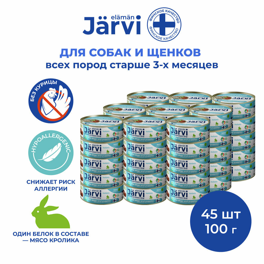 Влажный корм Jarvi монопротеиновые консервы для собак и щенков всех пород с 3-х месяцев, Кролик 100 г х 45 шт.: сравнение цен, характеристики, фото, актуальное наличие и цены.