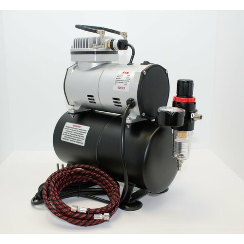 Легкий и компактный компрессор Jas 1203 предназначен для работы с аэрографом. Имеет возможность регулировки давления и автоматический регулятор давления, выключающий компрессор, когда его не используют. Рабочее давление стабилизируется ресивером. Поддерживает работу всех видов аэрографов с соплами любых диаметров. Применяется для моделирования, рисования, кондитерского производства, дизайна тканей, восстановления кожаных изделий, боди-арта, косметологии и так далее. Благодаря ресиверу объемом 3 л отсутствует проседание давления при работе аэрографом с широким соплом. Компрессор нагнетает в ресивер воздух до 4 атм, мотор отключается, воздух расходуется и давление падает до 3 атм, мотор включается автоматически. Запас воздуха позволяет некоторое время работать без включения электромотора. Компрессор имеет поршневую безмасляную конструкцию, которая не требует специального обслуживания. На компрессор установлен фильтр для очистки воздуха от пыли и влагоотделитель. Давление на выходе регулируется в диапазоне от 0 до 4 атм. Jas 1203 имеет небольшие размеры (около 30х30х12 см), обычно его размещают под рабочим столом. Имеет низкий уровень шума, можно использовать дома или в студии, не беспокоя окружающих. Характеристики: Вес: 4,7 кг. Фильтр-влагоотделитель: есть Защита от перегрева: есть Защита от повышенного давления: есть Манометр: есть Напряжение: 220 В Частота: 50 Гц Мощность: 150 Ватт Автоматический регулятор давления: есть Производительность: 23 л/мин. Регулировка давления: 0-4 кг/см2 Рекомендуемое сопло аэрографа: до 0,8 мм включительно Емкость ресивера: 3 л. Уровень шума: 42 дБ Ручная регулировка давления на выходе: есть Размер выходного штуцера: G 1/8" Длина сетевого кабеля: 1,9 м Специальный шланг Jas 1402 (G1/8" х G1/8") предназначен для соединения аэрографа и компрессора. Дополнительно защищен матерчатой оплеткой, что значительно продлевает срок его службы. Длина (3 м.) позволит работать на расстоянии от компрессора, который можно просто убрать под стол, либо спрятать, так как благодаря автоматике его не нужно включать/выключать во время использования. Шланг JAS 1402 в комплектации с 01.09.2022 г.