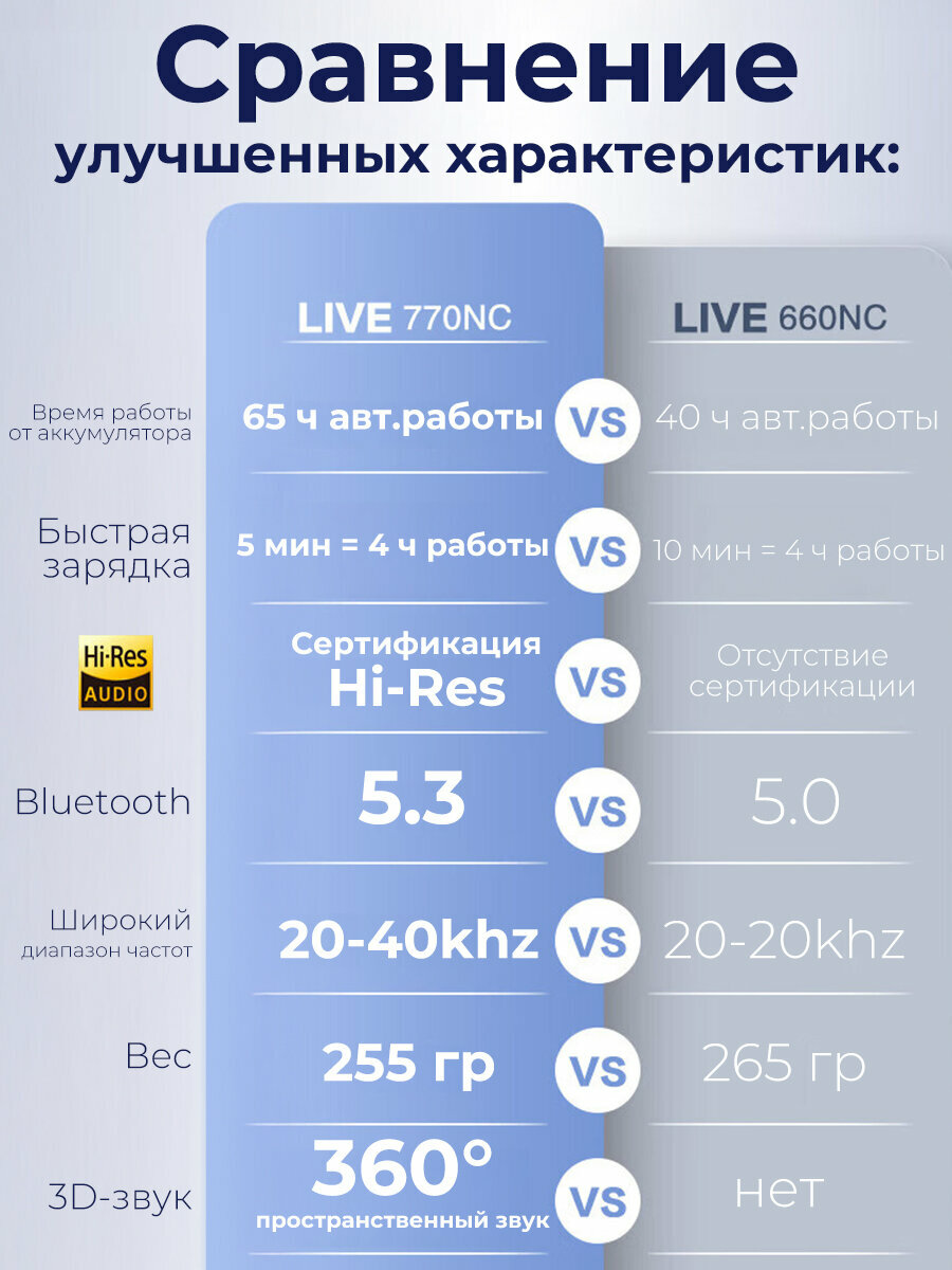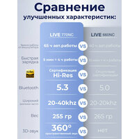 Наушники JBL Live 770NC обеспечивают мощный фирменный звук JBL в удобном и стильном оголовье полноразмерных наушников. Когда вы погружаетесь в свой мир музыки, полное адаптивное шумоподавление с технологией Smart Ambient позволяет не отвлекаться на посторонние звуки. Или вы захотите слышать, что происходит вокруг, продолжая слушать свой любимый плейлист или даже вести беседу, не снимая наушников. Вы можете легко получить доступ к любимому голосовому помощнику по команде или одним касанием чашки наушника, чтобы воспроизвести любимый плейлист, отправить сообщение своему другу, проверить погоду и многое другое. Вы сможете наслаждаться потоковой передачей музыки в течение 65 часов (50 часов с включенными Bluetooth и адаптивным шумоподавлением). Хотите большего? 5-минутная зарядка обеспечивает дополнительные 4 часа работы наушников. JBL Live 770NC подключается к двум устройствам Bluetooth® одновременно, поэтому вы никогда не пропустите вызов, даже во время просмотра видео на вашем планшетном устройстве.