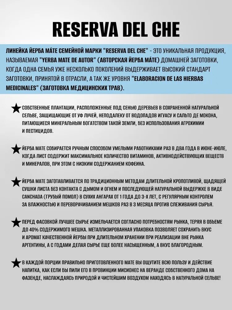 RESERVA 3 ANOS - Йерба Мате со стебельками. Сушка "barbacua" - 40 часов, натуральная выдержка 36 месяцев. Оптимальное сочетание активнодействующих веществ в листьях йерба мате. Лимитированный выпуск в небольшом объеме, сбалансированный помол для извлечения необыкновенных свойств йербы и необыкновенный вкус для тех, кто привык быть особенным.