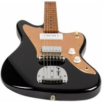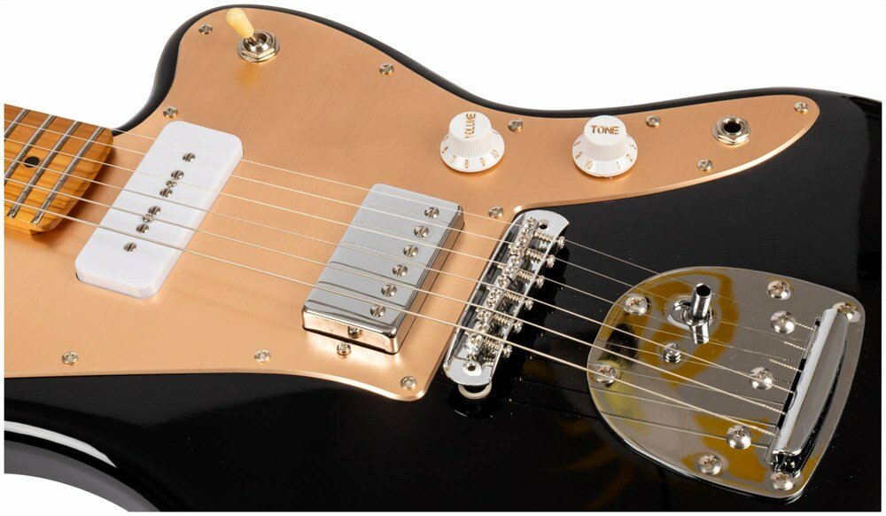 JET JJ-350 BGT - электрогитара, Jaguar, JET - это бренд электрогитар, созданный чтобы удовлетворить музыкантов всех уровней и способностей. Вдохновленные классическими электрогитарами высочайшего класса, гитары JET предлагают современный подход к дизайну и стилю со свежим и впечатляющим выбором цветов, отделки и высококачественной древесины. Самое главное, гитары JET дадут вам превосходные впечатления от игры по доступной цене. JET JJ-350 BGT это инструмент в легендарной форме корпуса - Jaguar. У инструментов серии 350 профиль грифа - Modern C. Это наиболее распространенный современный профиль грифа, у таких грифов удобный овальный профиль, который подходит для большинства стилей игры. Гриф и накладка на гриф выполнены из печеного клена (roasted maple). При такой обработке поры дерева максимально сжимаются и в процессе использования вода уже не будет выходить, ваша накладка не сожмется и лады не повылазят вне зависимости от влажности и смены температуры. Плюс такое дерево выглядит очень красиво. Конфигурация звукоснимателей у модели JET JJ-350 BGT - H+P90, Alnico V (по собственной спецификации JET) с никелевыми крышками. Бридж винтажное тремоло. Технические характеристики: Тип корпуса: JaguarМатериал корпуса: тополь запеченныйМатериал грифа: канадский печеный кленПрофиль грифа: Modern CНакладка на гриф: канадский печеный кленРадиус: 9,5"Ширина верхнего порожка: 41,91 мм (1,65")Порожек: PPSАнкерный стержень двойного действияМензура: 647,7 мм (25,5")Количество ладов: 22Звукосниматели: H+P90, Alnico V (спецификация JET), никелевые крышкиБридж: Vintage Tremolo Управление: 1V, 1T, 3-х позиционный переключательФурнитура: хромНакладка (пикгард): золотаяЦвет: BK / черный Характеристики: Материал корпуса: тополь запеченныйЗвукосниматели: HHКоличество струн: 6Материал накладки грифа: печеный кленМатериал грифа: клен запеченныйКоличество ладов, шт: 22Материал топа: тополь запеченныйКрепление грифа: на болтахТип бриджа: ФиксированныйНовинки: ДаСтрана происхождения: китайдля Начинающих: Дадля Обучения: ДаМатериал струн: металлРегулировки звука: 1V 1TФорма корпуса: JaguarМензура, мм: 648 ммСерия: JET 350Радиус накладки грифа: 9.5Профиль грифа: Modern "C"