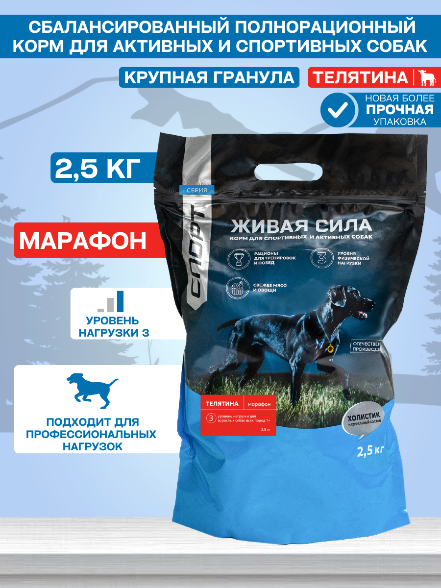 Живая сила Спорт, Марафон корм для собак всех пород с высокими нагрузками с телятиной и лососем, Крупная гранула (2,5 кг): сравнение цен, характеристики, фото, актуальное наличие и цены.