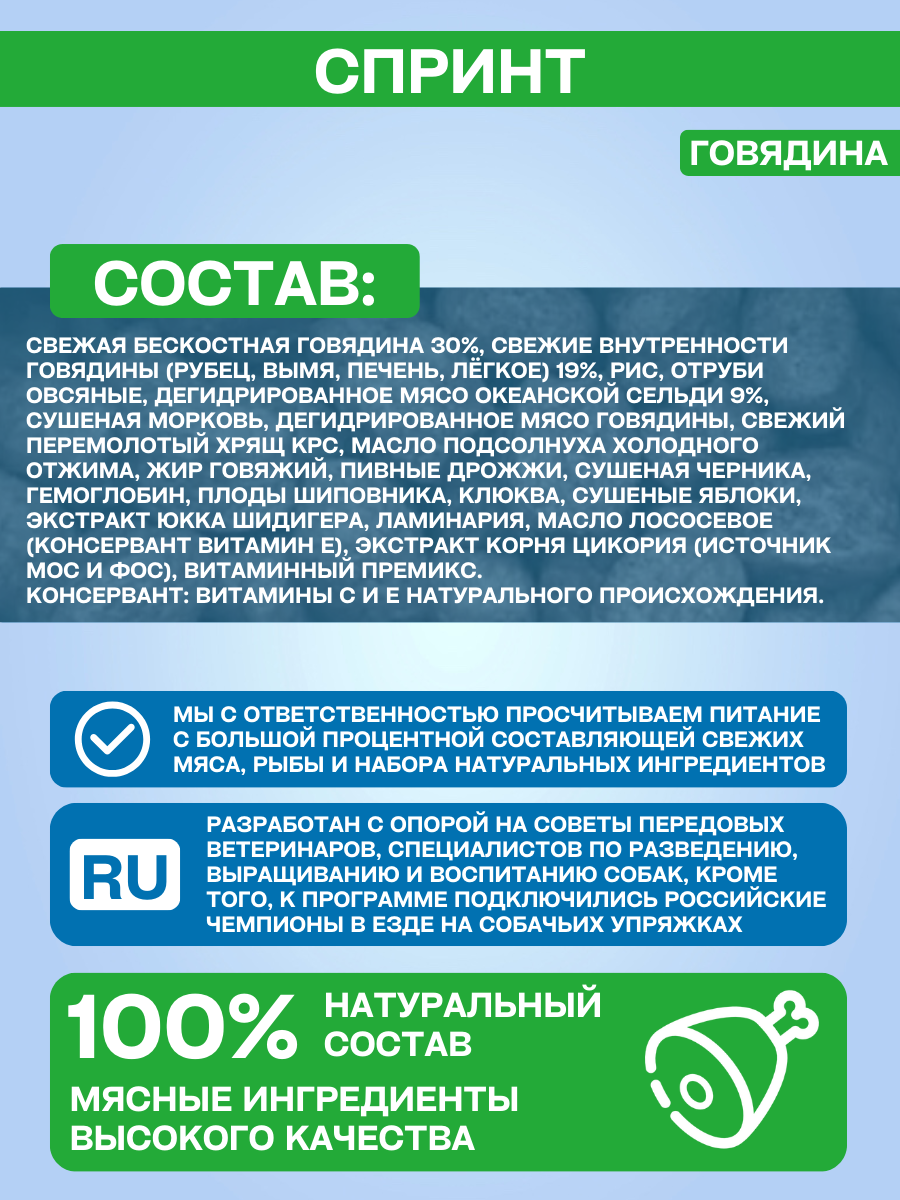 Корм Спринт безупречно подходит для питания спортивных собак, удовлетворяет не только потребности в питании, но также поможет питомцу оставаться в хорошей физической форме и легко восстанавливаться после тренировок и соревнований.