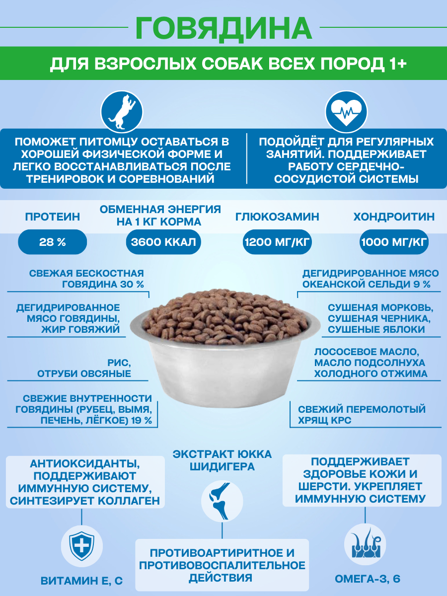 В основе рациона свежее мясо говядины. Говядина легко усваивается и одновременно отличается высокой питательностью, а кроме того, содержит уникальный набор ценных элементов — витаминов и минералов, среди которых витамин E и железо. Говядина отлично восстанавливает силы, укрепляет мышцы и сосуды животных.