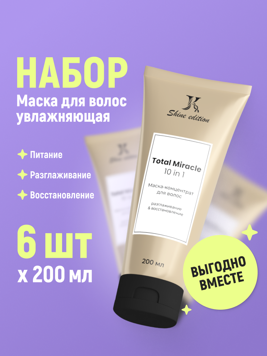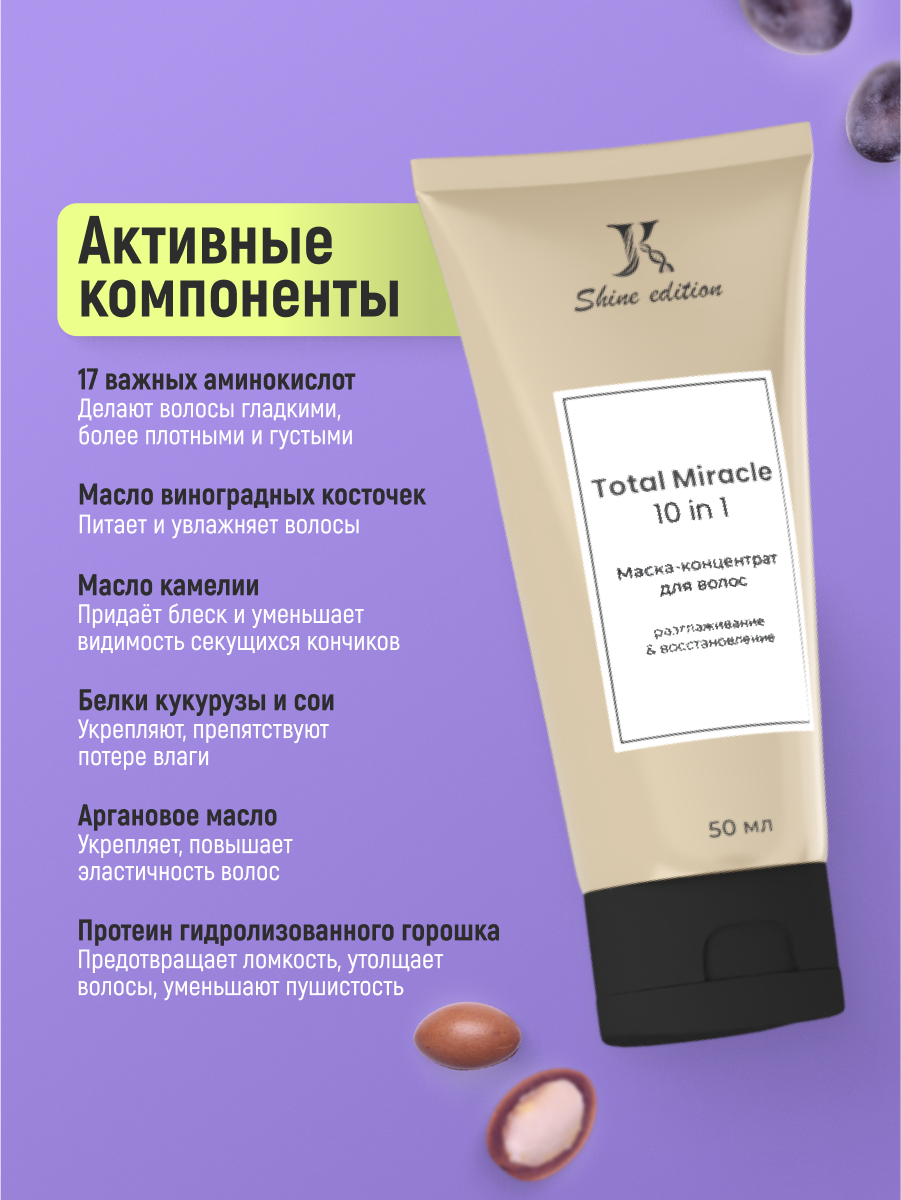 Маска-концентрат Total Miracle 10 in 1 — это универсальное средство для ухода за волосами, идеально подходящее как для восстановления после процедур, таких как кератиновое выпрямление, ботокс, нанопластика, химическая завивка и окрашивание, так и для регулярного использования. Маска эффективно ухаживает за сухими, повреждёнными и пористыми волосами, требующими дополнительного питания и защиты. Уникальная формула с аргановым маслом, маслом камелии и гидролизованными протеинами питает волосы, придаёт им блеск и защищает от негативного воздействия окружающей среды.