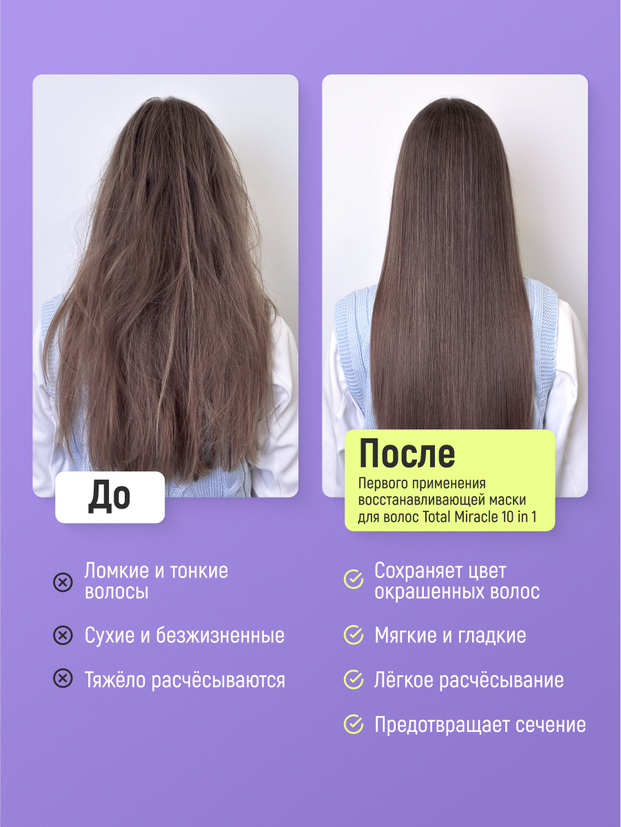 Используя Total Miracle 10 in 1, вы получаете полноценный уход, благодаря которому волосы становятся гладкими, мягкими и послушными уже после первого применения!