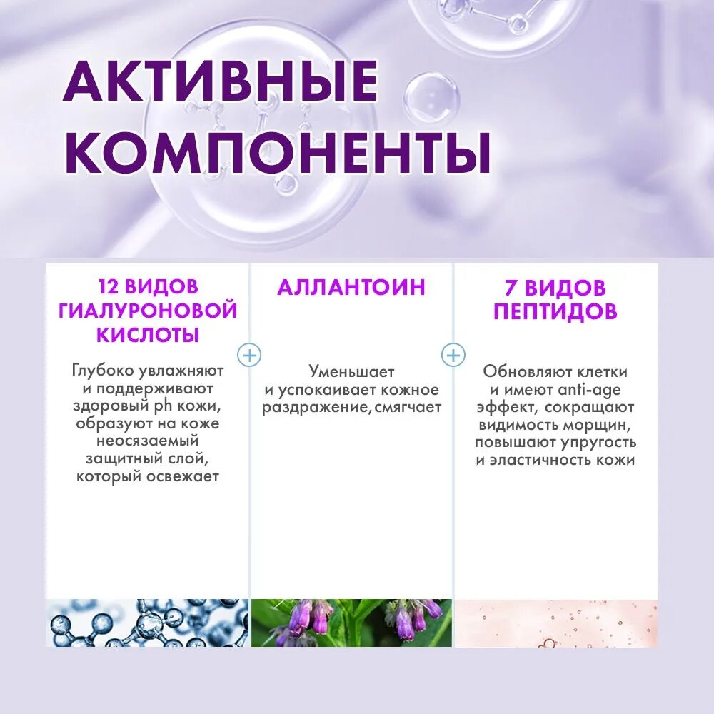 | Состав | Water, Glycerin, Glycereth-26, Methylpropanediol, Dipropylene Glycol, Carbomer, Arginine, Hydroxyethyl Urea, Polyglyceryl-10 Laurate, Allantoin, Xanthan Gum, Hydroxyethylcellulose, Panthenol, Betaine, Butylene Glycol, Dipotassium Glycyrrhizate, Centaurea Cyanus Flower Extract, Sodium Hyaluronate, Hydrangea Macrophylla Leaf Extract, Hydrolyzed Hyaluronic Acid, Hydrolyzed Sodium Hyaluronate, Saccharomyces Polypeptides, Hydroxypropyltrimonium Hyaluronate, Glycine Max (Soybean) Polypeptide, Sodium Acetylated Hyaluronate, Dimethylsilanol Hyaluronate, Acetyl Hexapeptide -8, Sodium Hyaluronate Crosspolymer, Hyaluronic Acid, Pentylene Glycol, Potassium Hyaluronate, Palmitoyl Pentapeptide 4, Palmitoyl Tripeptide 5, Palmitoyl Tripeptide-1. Acetyl Tetrapeptide 5, Hydroxyacetophenone, Caprylyl Glycol, Ethylhexylglycerin, Disodium EDTA, 1,2 Hexanediol |
