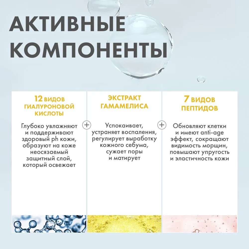 | Состав | Water, Glycereth-26, Propanediol, Glycerin, Butylene Glycol, Betaine, Caprylyl Glycol, Allantoin, Prunus Serrulata Flower Extract, Tocopherol, Ethylhexylglycerin, Dipotassium Glycyrrhizate, Xanthan Gum, Panthenol, Trehalose, 1,2 Hexanediol, Sodium Hyaluronate, Hydrolyzed Hyaluronic Acid, Hydrolyzed Sodium Hyaluronate, Sodium Acetylated Hyaluronate, Hydroxypropyltrimonium Hyaluronate, Dimethylsilanol Hyaluronate, Sodium Hyaluronate Crosspolymer, Potassium Hyaluronate, Hyaluronic Acid, Pentylene Glycol, Acetyl Tetrapeptide 5, Palmitoyl Tripeptide-1, Palmitoyl Pentapeptide-4, Palmitoyl Tripeptide 5, Acetyl Hexapeptide 8, Saccharomyces Polypeptides, Glycine Max (Soybean) Polypeptide, Hydroxyethylcellulose, Arginine, Carbomer, Dipropylene Glycol, Hydroxyacetophenone, Disodium EDTA |