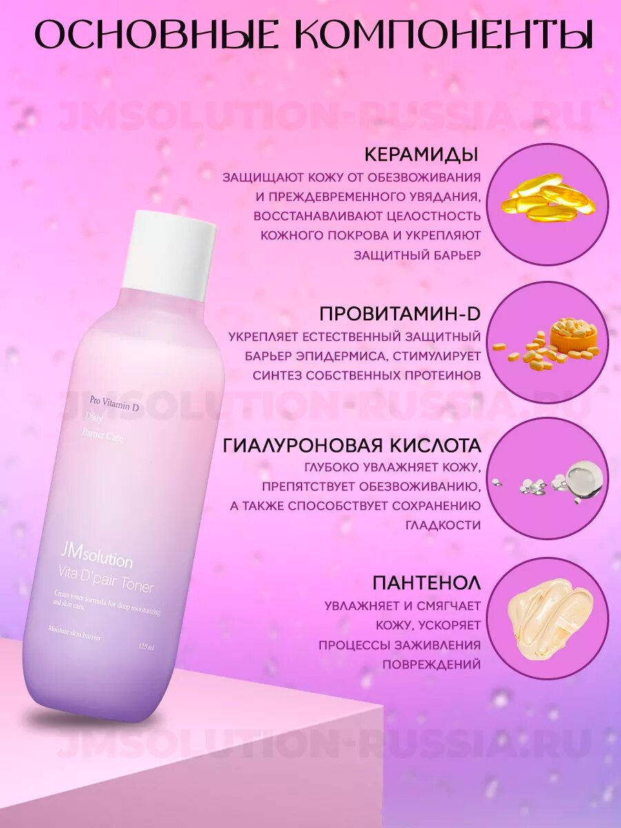 | Активный ингредиент | AHA-кислоты, PHA-кислоты, аденозин, аллантоин, аминокислоты, арбутин, аргинин, бета-глюкан, бетаин, витамин A (ретинол), витамин B3 (ниацинамид), витамин C (аскорбиновая кислота), витамин E, витамины, водоросли, гиалуроновая кислота, глицерин, глутатион, керамиды, коллаген, коллоидное золото, лимонная кислота, липиды, молочко маточное, морские водоросли, морские минералы, мочевина, муцин улитки, пантенол (провитамин B5), пептиды, пробиотики, протеины жемчуга, салициловая кислота, сквалан, транексамовая кислота, центелла азиатская, церамиды, цинк |