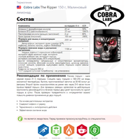 Cobra Labs The Ripper - это предтреник и жиросжигатель одновременно! Мощная матрица для поддержки мышц + активная матрица для сжигания жира. Теперь наращивание сухой мышечной массы возможно! Больше силы и энергии, яркая венозность и невероятный памп! Поддерживайте качественную форму даже в межсезонье. Ripper станет лучшей добавкой для любого спортсмена, желающего иметь плотную сухую мускулатуру. Преимущества продукта: • Суперсильный жиросжигатель • Быстродействующий • Великолепный вкус • Ежедневная активность • Контроль аппетита • Активный в течение всего курса приема • Не содержит глютена Экстремальная мышечная матрица (Бета-Аланин, Таурин, Экстракт Гуараны, Экстракт Малины, Кофеин) - продление тренировочного времени, мышечная выносливость, уменьшение количества молочной кислоты (избавление от закрепощения мышц и отсрочка отказа). Жиросжигающая матрица (Ацетил-Л-Карнитин, Экстракт Зелёного Кофе, Экстракт Зелёного Чая, Экстракт Коры Корицы, Экстракт Оливковых Листьев) - разгон метаболизма, повышение температуры тела, стимуляция липолиза. Ripper является одним из самых эффективных и быстродействующих новых сжигателей жира на рынке. Это большой выбор вкусов, его активная формула смешивается в считанные секунды и начинает действовать в течение нескольких минут после первого приема. Это сжигание жира Вы можете чувствовать. Предтреник Ripper Cobra Labs особенно показан для спортсменов в период сушки, перед выступлениями или соревнованиями. Содержание питательных веществ в одной порции (1 ложка - 5 г): Калории - 5 Всего жиров - 0 г Холестерин - 0 мг Всего углеводов - 1 г Пищевые волокна - 0 г Сахар - 0 г Белок - 0 г Витамин С - 45 мг Витамин B12 - 25 мкг Пантотеновая кислота - 4 мг Хром - 100 мкг Экстримальное мышечное топливо - 3055 мг: CarnoSyn® (Бета-Аланин) Таурин Экстракт гуараны Кетоны малины Кофеин Матрица для рельефных мышц - 106 мг: Ацетил L-карнитин HCL Экстракт зеленого кофе Экстракт зеленого чая Экстракт коры корицы Экстракт оливковых листьев Другие ингредиенты: лимонная кислота, натуральные ароматизаторы, силикат кальция, диоксид кремния. За 15 минут до завтрака смешайте 1 черпак (5г) со 180-250 мл холодной воды. Принимайте по одной порции в течении 2-х дней для оценки толерантности. Через пару дней, если все будет в порядке, норму можно будет увеличить до двух черпачков. Оптимальное время для приема второй порции The Ripper, спустя 5-6 часов после употребления первого черпачка.