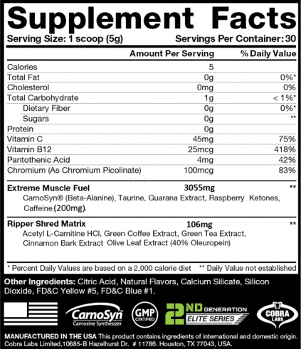 | Дополнительная информация | состав: бета-аланин, мальтодекстрин, искусственный ароматизатор (арбузный леденец), таурин, ацетил-L-карнитин гидрохлорид, экстракт плодов гуараны, кетоны малины, регулятор кислотности: (Е296), Е334), (Е330); кофеин, экстракт зеленого кофе, экстракт зеленого чая, агенты антислеживающие: (Е552), (Е551), витамин С (аскорбиновая кислота), экстракт коры корицы, экстракт листьев оливы, хрома пиколинат, пантотеновая кислота (кальция D-пантотенат), подсластители: (Е950), (Е955), пищевой краситель: (Е162), витамин В12 (метилкобаламин).; рекомендации по применению: смешайте 1 мерную ложку продукта и 180–250 мл (6–8 унций) холодной воды; принимайте 1–2 раза в день; для достижения оптимальных результатов принимайте за 30–60 минут до еды: первую порцию перед завтраком, вторую — позже в течение дня; используйте в сочетании с низкокалорийной диетой и программой упражнений; не принимать больше 2 порций в день; применять только согласно инструкции |