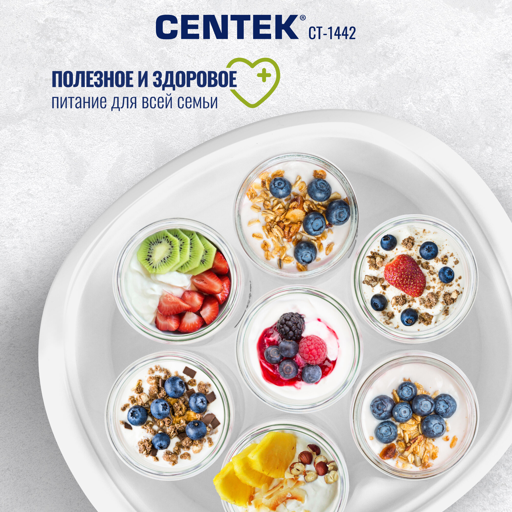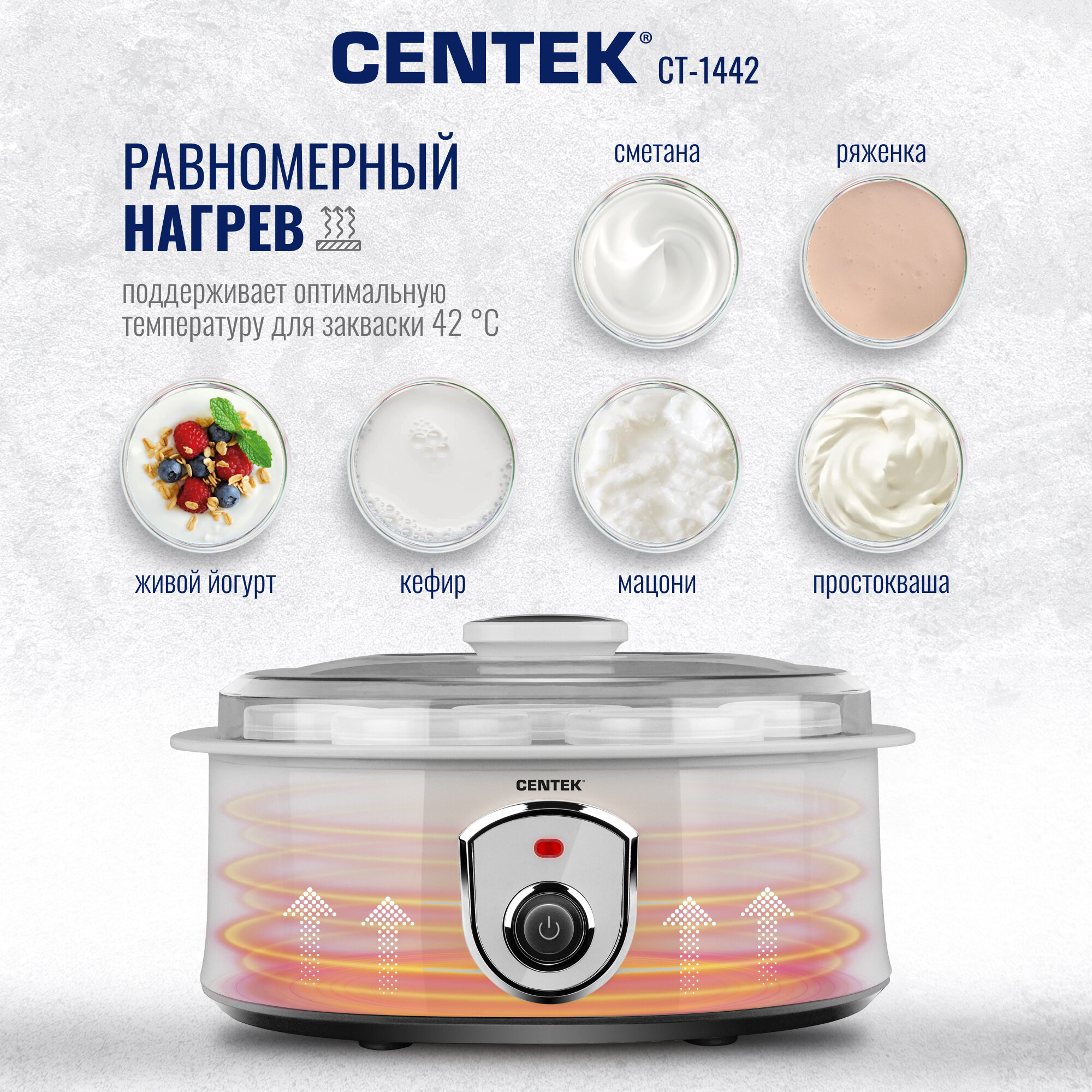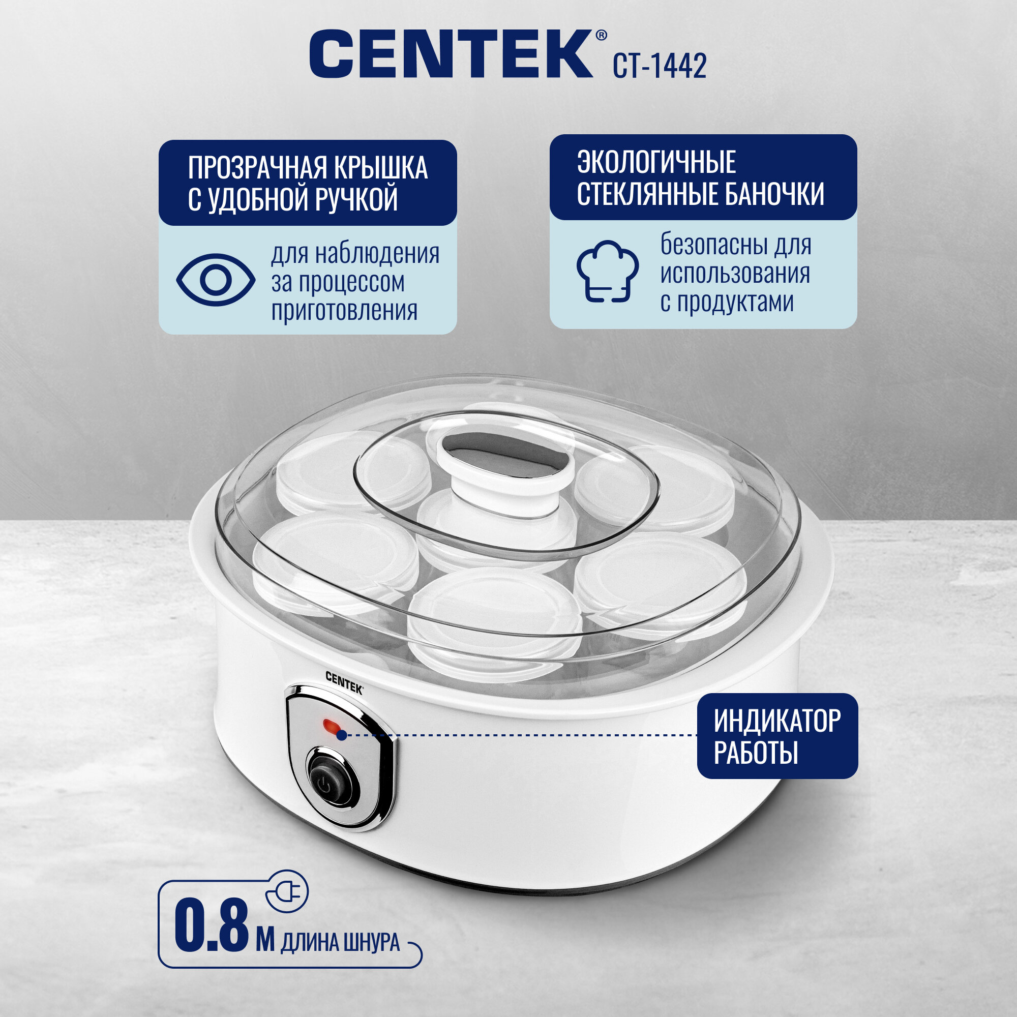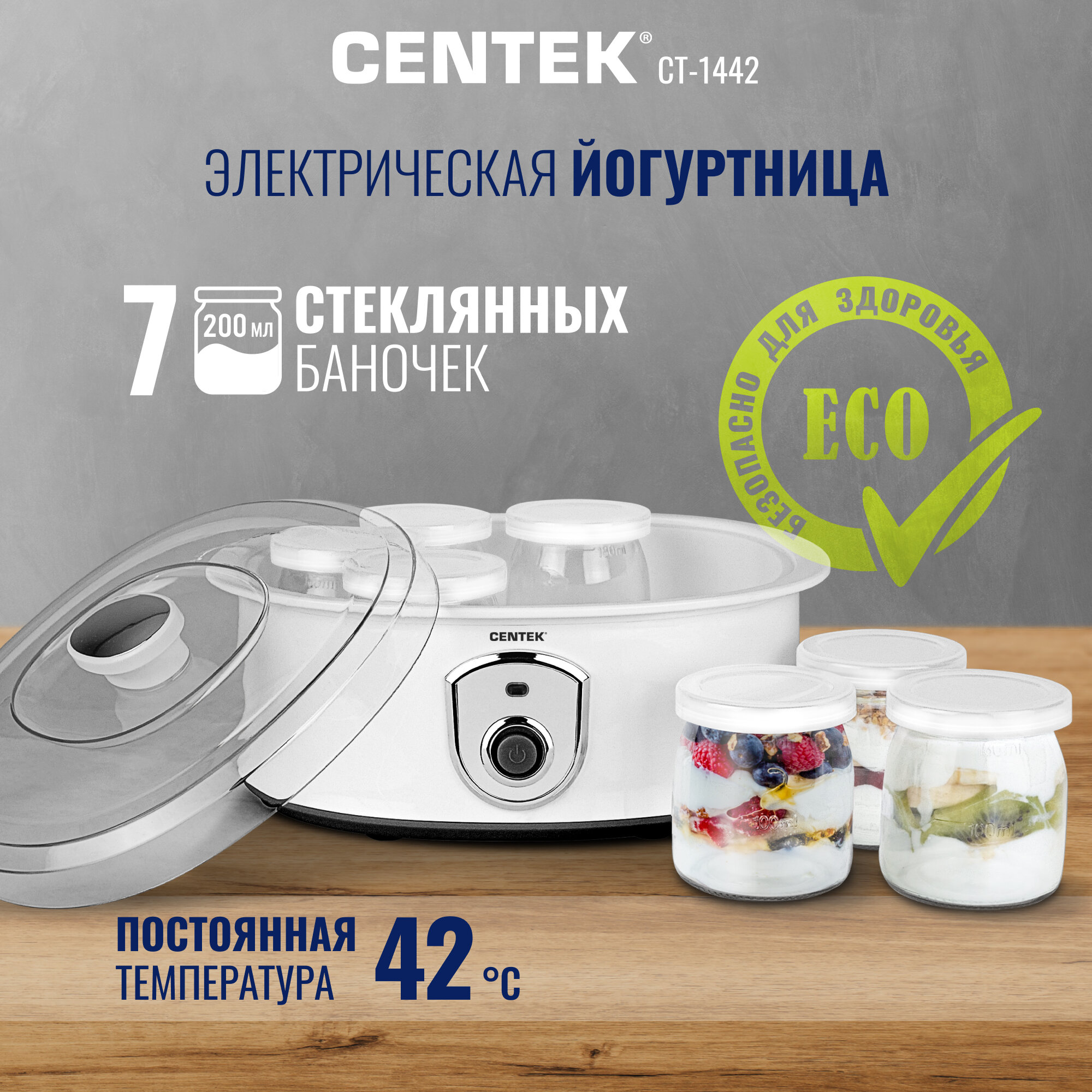 Йогуртница Centek CT-1442 для приготовления живых йогуртов, кефира, ряженки, простокваши, сыра и других кисломолочных продуктов в домашних условиях без красителей и консервантов. В комплект входят 8 стеклянных баночек с крышками, каждая баночка объемом 200 мл. . Возможность приготовления йогурта, кефира, сметаны, простокваши, ряженки, мацони и домашнего сыра. Подходит для приготовления кисломолочных продуктов для детей.