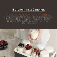 К йогуртнице идут 8 стеклянных баночек по 200 мл, в которых готовый йогурт можно хранить в холодильнике. Стеклянные баночки сохраняют натуральные свойства домашнего йогурта, а также являются экологически чистым материалом.