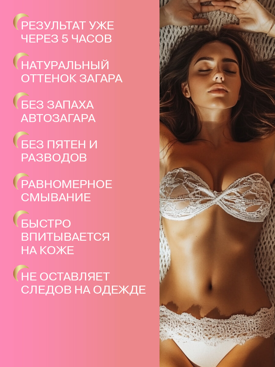 Этот автозагар для тела и лица обеспечит вам эффект солнечного загара, не подвергая вашу кожу воздействию вредных ультрафиолетовых лучей. Он идеально подойдет тем, кто стремится к красивому цвету кожи без необходимости проводить время на солнце.
