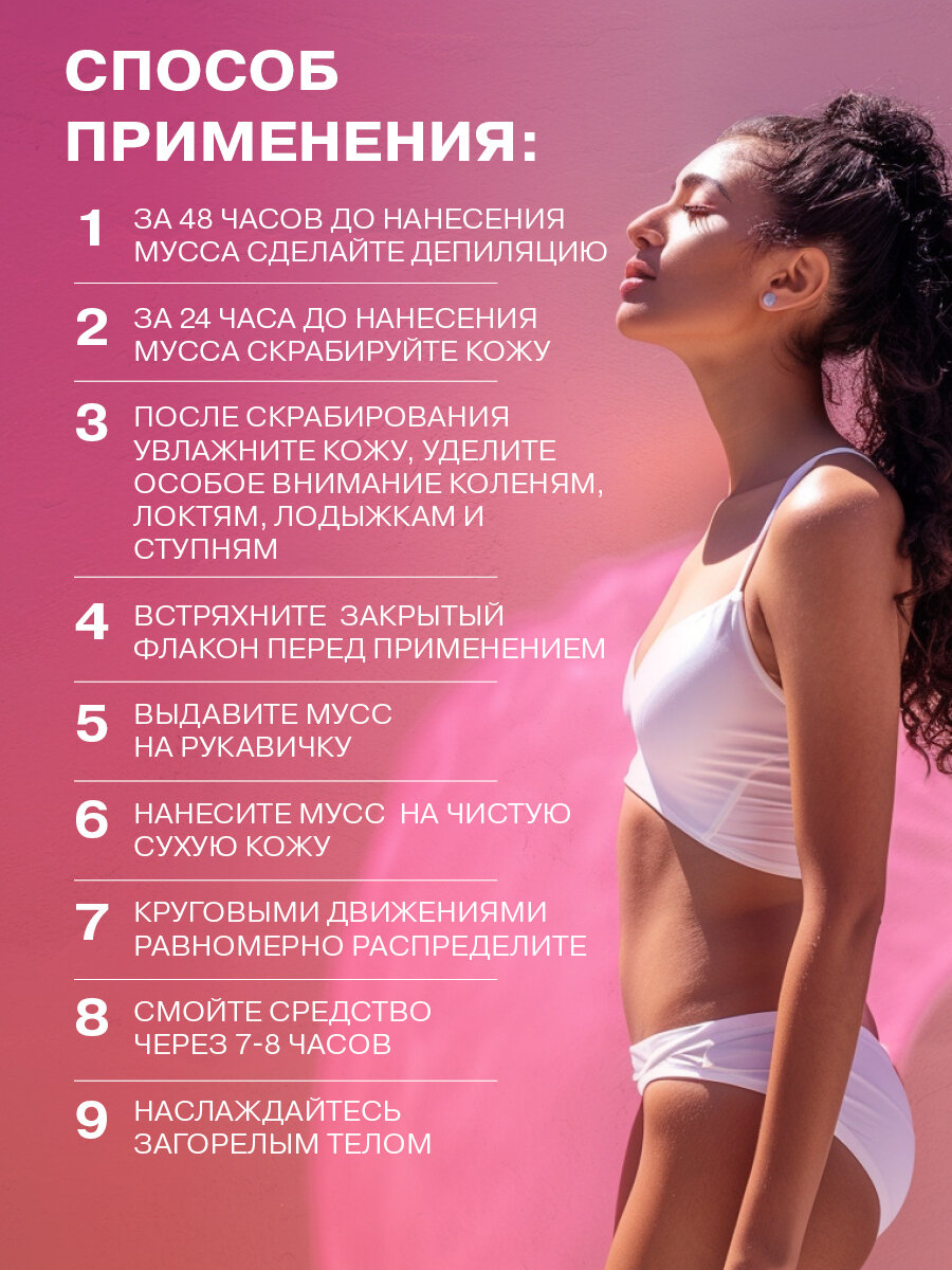 Погрузитесь в мир красивого загара с этим продуктом, который легко вписывается в любую рутину ухода. Просто нанесите мусс на очищенную и сухую кожу, распределите с помощью рукавички и наслаждайтесь эффектом, который сохранится на несколько дней. Выглядите великолепно и чувствуйте себя уверенно в любой ситуации.