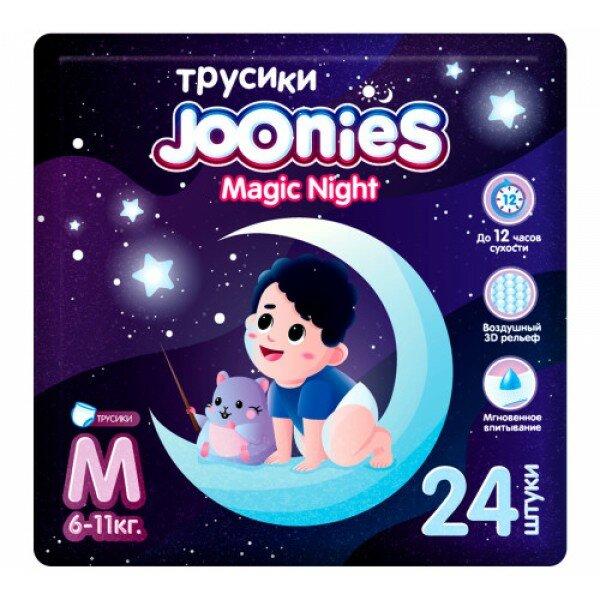 Купить Joonies Magic Night Подгузники-трусики, размер M (6-11 кг), 24 шт с доставкой по всей России. Joonies Magic Night Подгузники-трусики, размер M (6-11 кг), 24 шт: сравнение цен, характеристики, фото, актуальное наличие и цены.