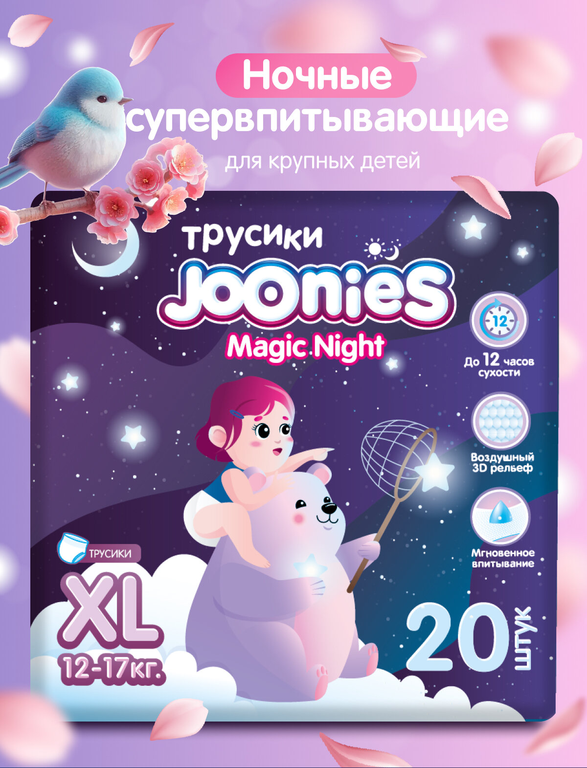 Купить Joonies Magic Night Подгузники-трусики, размер XL (12-17 кг), 20 шт с доставкой по всей России. Joonies Magic Night Подгузники-трусики, размер XL (12-17 кг), 20 шт: сравнение цен, характеристики, фото, актуальное наличие и цены.