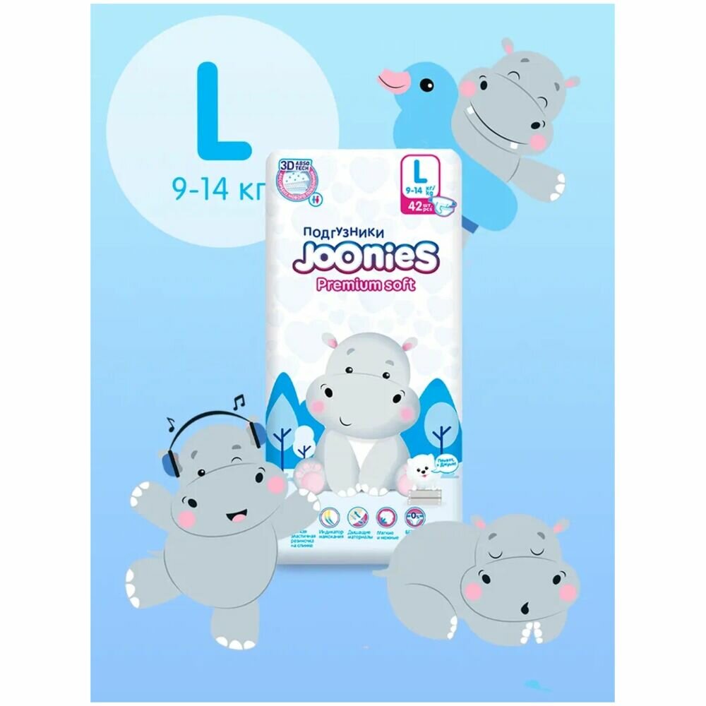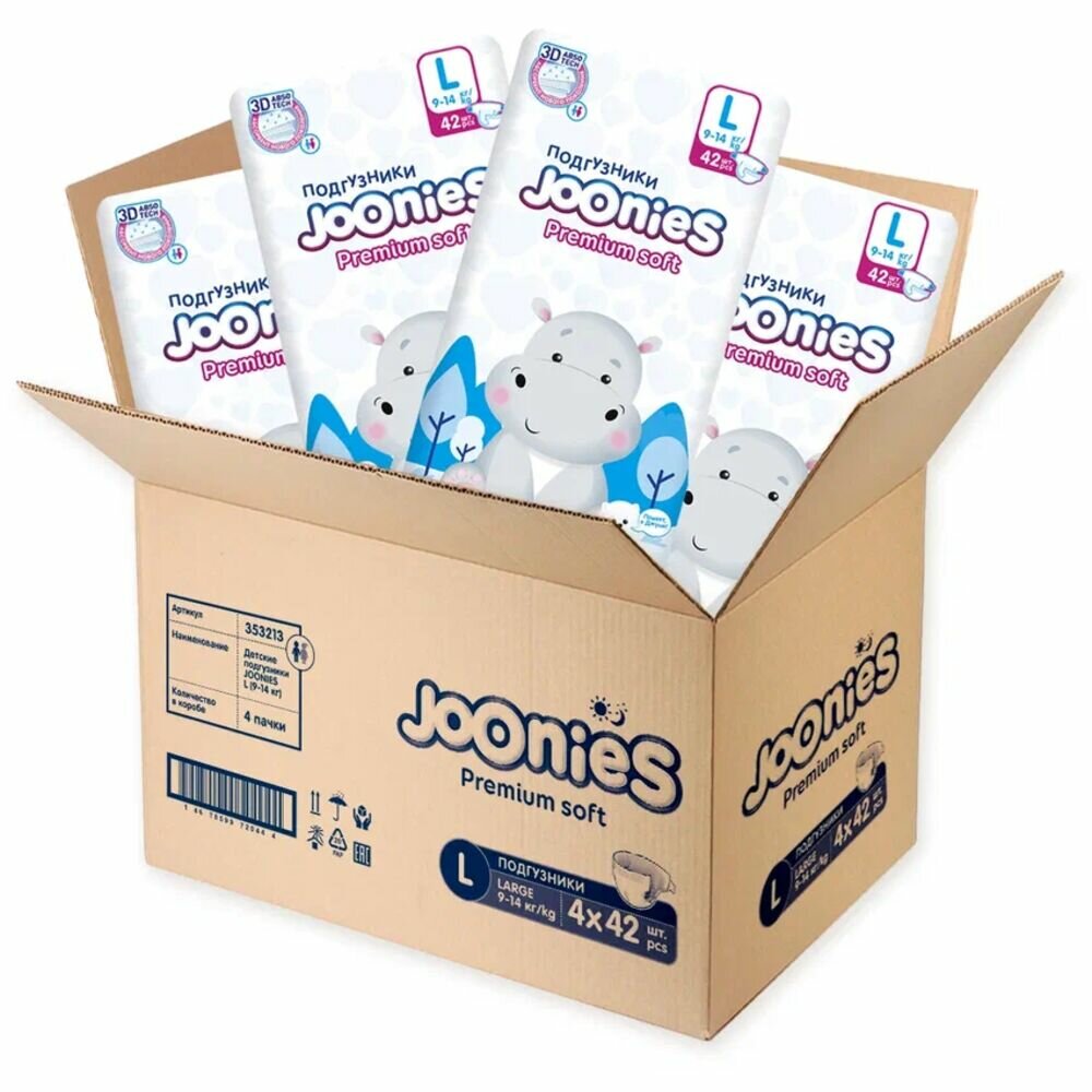 Купить Joonies Подгузники Premium Soft, L (9-14 кг.), 42 шт, 4 упаковки с доставкой по всей России.