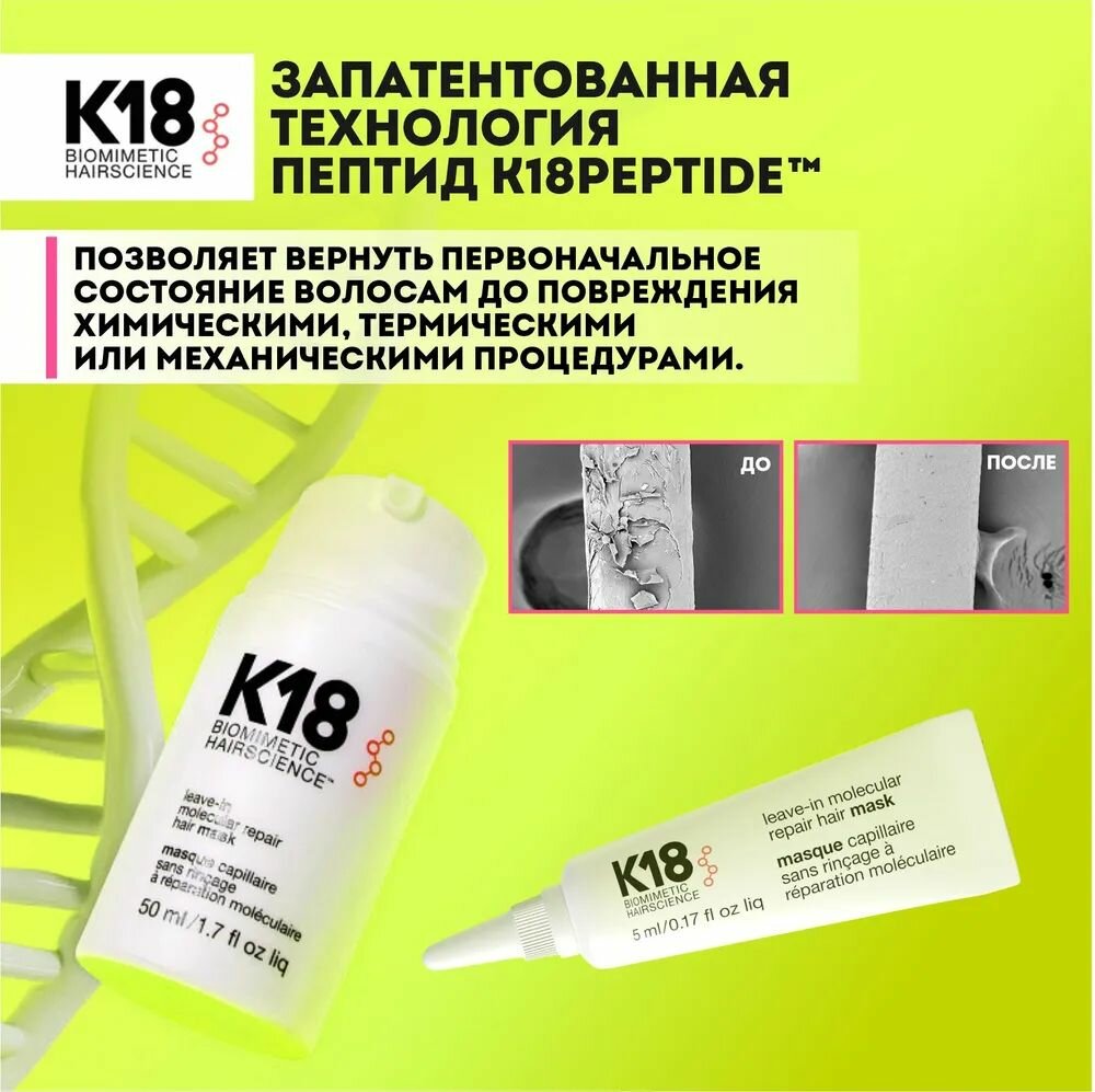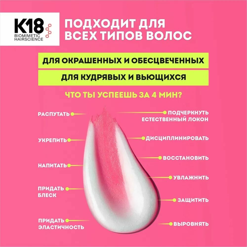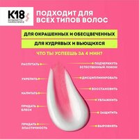 | Способ применения | 1. Вымойте волосы шампунем, НЕ ИСПОЛЬЗУЙТЕ КОНДИЦИОНЕР. 2. Уберите излишки влаги при помощи полотенца. 3. Выдавите небольшое количество маски K18: 1—4 нажатия дозатора в зависимости от длины, густоты и состояния волос. 4. Разотрите в ладонях до появления однородной белой эмульсии. 5. Равномерно распределите руками от корней до кончиков волос и оставьте на 4 минуты. НЕ СМЫВАЙТЕ! 6. Уложите волосы как обычно. Для получения оптимального результата используйте во время следующих 4–6 процедур мытья волос. Затем, для поддержания результата, после каждой 3–4 процедуры |