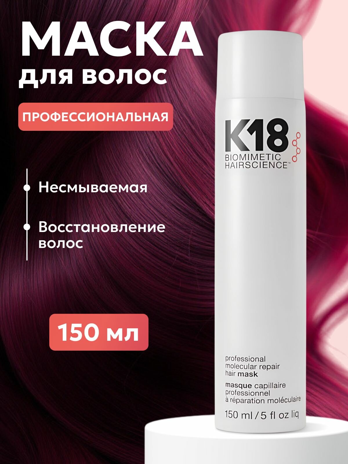 | Комплектация | K-18 ПРОФЕССИОНАЛЬНАЯ МАСКА ДЛЯ МОЛЕКУЛЯРНОГО ВОССТАНОВЛЕНИЯ ВОЛОС, 150 МЛ (1 шт.) |