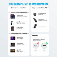 Кабель совместим со всеми устройствами USB-C, включая смартфоны, ноутбуки, планшеты и камеры.