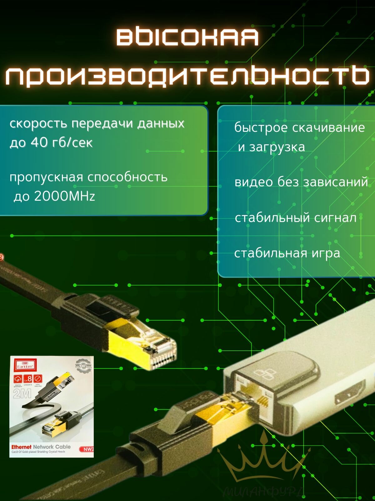 Плоский медный кабель CAT8 с защитой от помех. 8-ми жильный сердечник из чистой меди выдает самое высокие показатели для более стабильной передачи данных. Соответствует стандарту гигабитного сетевого кабеля с высокоскоростной передачей до 40 Гбит/с, сигнал стабилен без затухания. Сверхдлительный срок службы засчет хорошей защиты прочного PVC материала. Конструкция с вилкой и нажатием пальца является портативной и стабильной-никогда не ослабевает при длительном использовании. Идеально подходит для использования в любых условиях при подключении домашнего компьютера, ноутбука , лэптопа, роутера, ТВ приставки, телевизора и других устройств.