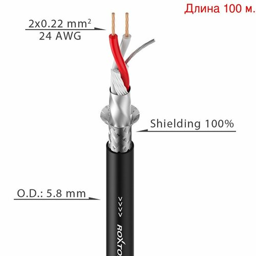 Кабель DMX из бескислородной меди на бухте 100 метров. D: 5.8 мм. 2 x 0.22 мм². AWG: 24. Плотность экранирования: 100% (сетка из луженой меди 64 х 0.10 мм + алюминиевая фольга (AL/PT) + шнур из луженой медной проволоки 7 х 0.20 мм). Цвет: Четрный.