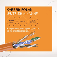 Бренд Folan Количество пар: 4 пары Категория кабеля: 5e Тип оболочки: ZH нг(А)-HF Диаметр проводника 0,52 мм Тип упаковки: 305 м Материал жилы: Cu Тип прокладки: Внутренняя Экран: Нет Подвес: Нет Цвет: Оранжевый Страна производства Россия