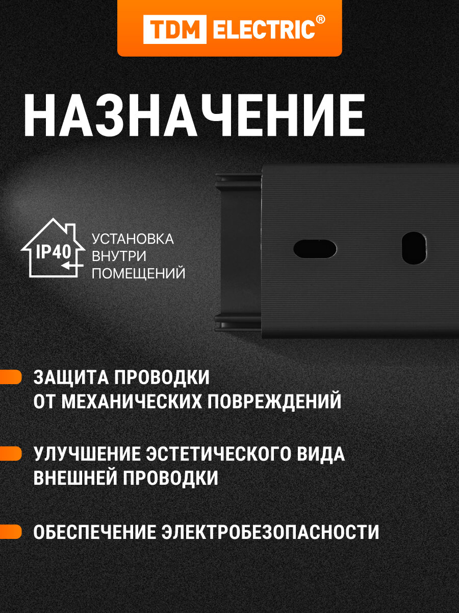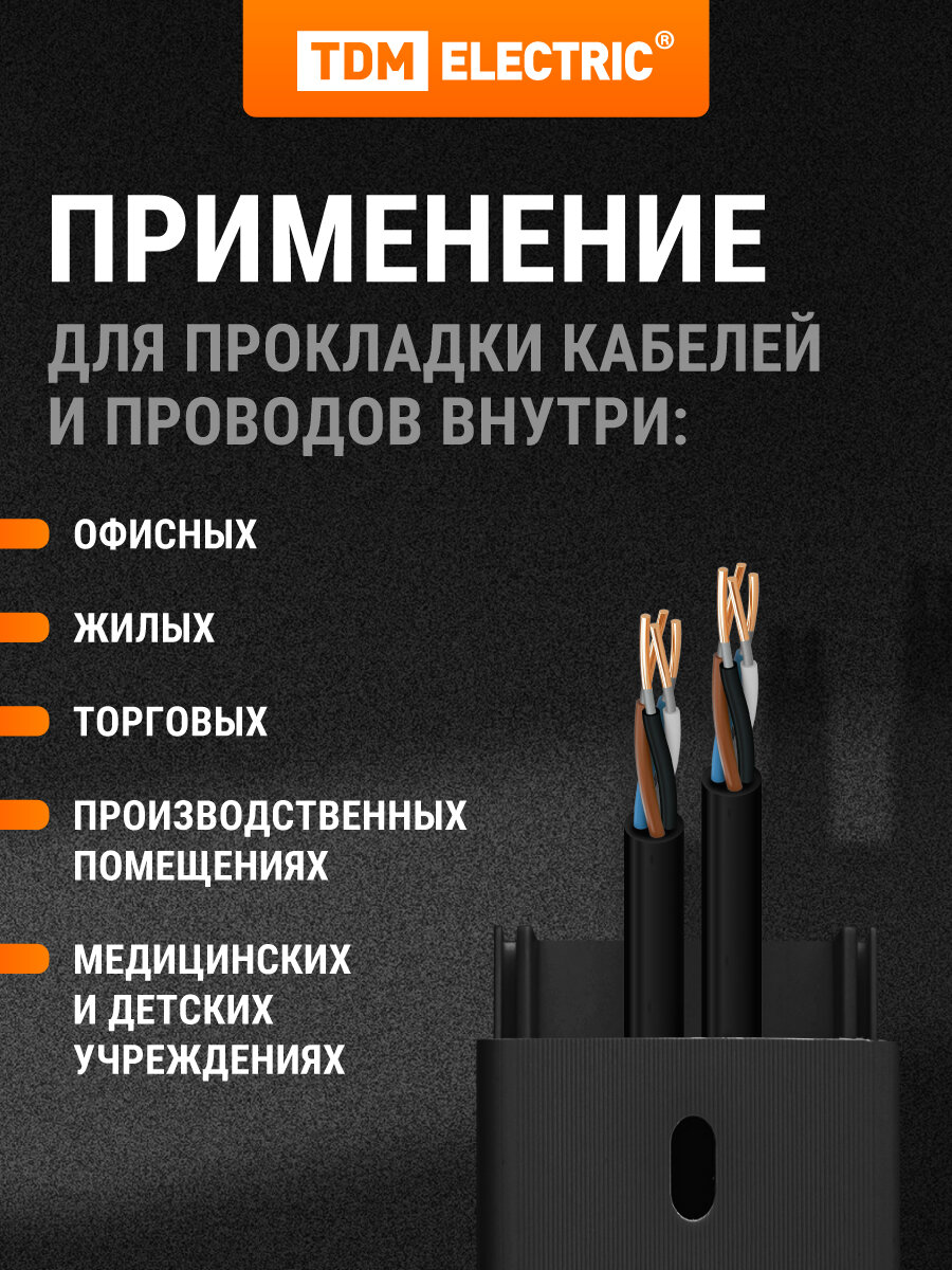 Кабель канал черного цвета, представляет собой идеальное решение для организации проводки в вашем доме или офисе. Этот кабель-канал поможет вам легко и аккуратно скрыть электрические провода, обеспечивая при этом дополнительную защиту от внешних воздействий. Изготовленный из прочного, самозатухающего материала, кабель-канал отличается высокой устойчивостью к механическим повреждениям и долговечностью, что делает его надежным выбором для любых условий эксплуатации. Гармонично впишется в любой интерьер, позволяя сохранить аккуратный и эстетически приятный вид помещений. Кабель-канал обеспечивает простоту монтажа, что позволяет быстро и без лишних затрат установить его самостоятельно. Он идеально подходит для установки в жилых и коммерческих помещениях, обеспечивая безопасный и аккуратный подход к укладке проводов. Благодаря своим качествам, этот кабель-канал станет отличным помощником в ремонте и строительстве, упрощая процесс электромонтажных работ и позволяя вам создавать аккуратные и безопасные проводки. Не упустите возможность приобрести этот практичный и функциональный продукт, который сделает ваши электрические системы более организованными и безопасными. В ассортименте TDM Electric есть все необходимые аксессуары и комплектующие для быстрого монтажа кабель-канала.