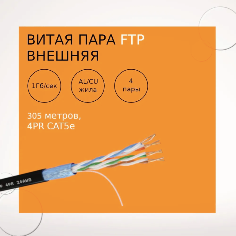 Четырехпарные кабели категории 5e на основе витой пары предназначены для использования в системах передачи данных со скоростью до 1 Гбит/c. Кабель выполнен в экранированном исполнении (FTP), соответствует категории 5e и предназначен для внешней прокладки. Поставляется в картонных коробках, по 305 м.