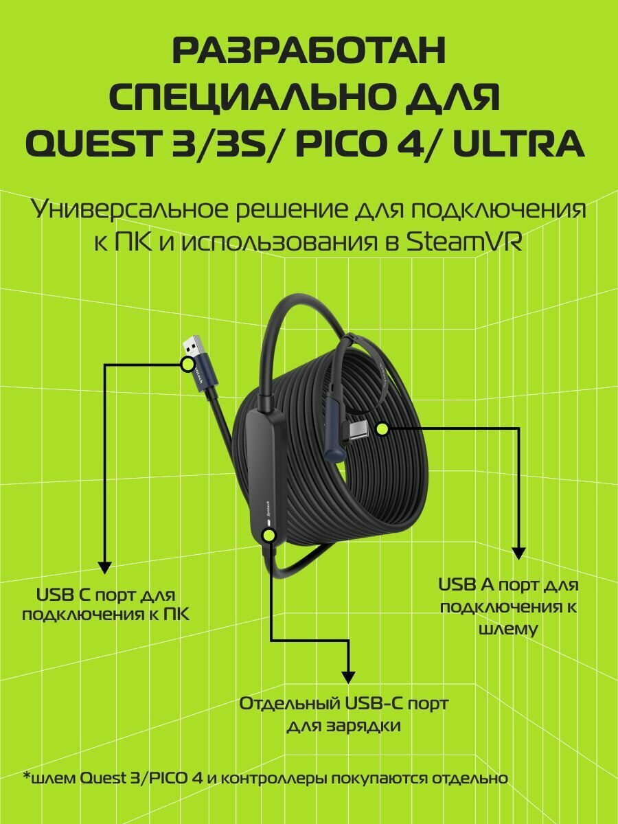 Представляем вам кабель Syntech Link, идеальное решение для пользователей Quest 3, Quest 3S, Pico 4 и Pico Ultra. Этот кабель обеспечивает надежное соединение и удобство в использовании, позволяя вам свободно перемещаться во время игры или просмотра контента. С его помощью вы сможете быстро и эффективно подключать свои устройства для зарядки или передачи данных.