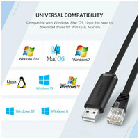 Кабель USB-A к RJ45 напрямую подключает компьютер или ноутбук через стандартный порт USB-A к сетевому коммутатору, маршрутизатору и т. д. с консольным портом. Со стандартом последовательного протокола RS232 (адаптер RS232/DB9 не требуется). Практичный последовательный кабель для сопряжения с фирменным маршрутизатором, коммутатором, брандмауэром, контроллером беспроводной локальной сети и другими устройствами с консольным портом, такими как Cisco, Ubiquiti, Ubiquiti, TP-Link, Linksys, Juniper, Fortigate, Mikrotik, Huawei, HP ProCurve. Питание от порта USB, внешний адаптер питания не требуется. С чипом FTDI-FT232 полностью поддерживает Windows 10, Windows 8 / 8.1, Windows 7, Windows XP, Windows Vista, Mac OS, Linux. Стандарт USB 2.0, обратная совместимость с USB 1.1. Встроенная схема защиты от электростатических перепадов, устойчивость к статическому напряжению 4 кВ.