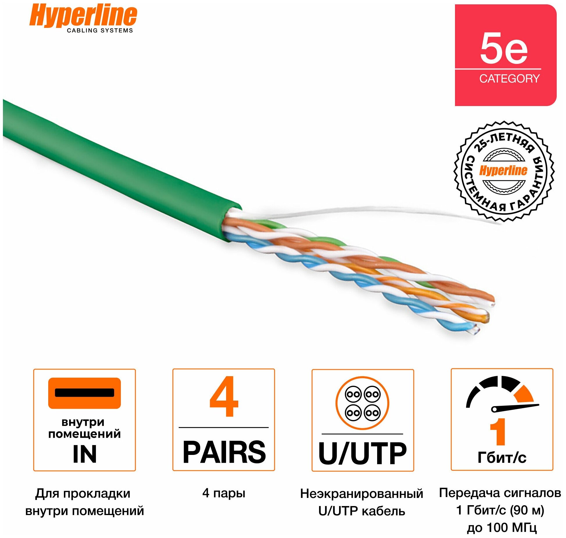 Интернет кабель имеет следующие характеристики: ● Категория (TIA/EIA): 5e ● Количество пар: 4 ● Конструкция кабеля: U/UTP ● Наличие рипкорда: Да ● Толщина оболочки: 0.5 мм Конструкция проводников: однопроволочная (solid). Калибр AWG: 24 AWG. Номинальный диаметр проводника: 0,51 мм. Сечение проводника: 0,205 кв. мм. Материал проводников: медь электролитическая отожженная (BC). Изоляция проводников: полиэтилен высокой плотности (HDPE). Диаметр проводника в изоляции: 0.89 мм. Предельное отклонение по диаметру проводника в изоляции: 0,04 мм. Кабель для интернета соответствует стандартам пожаробезопасности IEC: IEC 60332-1 Соответствие стандартам ANSI/TIA/EIA: ANSI/TIA/EIA-568-С.2 Провод одножильный медный весит 31.8 кг на 1 км. Длина кабеля в упаковке: 100 м Кабель витая пара имеет гарантию компонентную: 15 лет. Гарантия системная: 25 лет Допустимое растягивающее усилие (монтаж): 110 Н. Допустимое растягивающее усилие (эксплуатация): 92 Н. Минимальный срок службы для кабелей витая пара в оболочке из термопластичной композиции, не содержащей галогенов, составляет 15 лет. Фактический срок службы провода одножильного определяется техническим состоянием кабеля. Срок службы исчисляется с даты изготовления кабеля. Провод витая пара имеет зеленый цвет. Внешний диаметр: 5.1 мм. Материал внешней оболочки кабеля одножильного медного: LSZH. Используйте кабель витая пара 100 м внутри помещений. Температура эксплуатации: -20 °C . +75 °C.