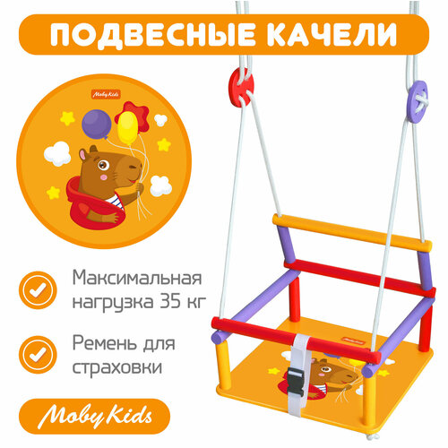 Детские качели «Капибара» от ТМ Moby Kids прекрасно подойдут для активного отдыха ребенка. Качели имеют сплошное широкое деревянное сиденье со специальным детским привлекательным дизайном. Размеры сиденья – 33х32 см – обеспечивают удобную посадку ребенка и полный комфорт при качании. У данной модели на сиденье изображена милая капибара. Детские качели полностью безопасны для использования: в конструкции предусмотрены заградительные планки, а также специальный ремень, который препятствует соскальзыванию ребенка вниз. К перекладине присоединяются с помощью усиленных петель с особыми фумигаторами («пуговицами») – они обеспечивают стабильное положение качелей без перекосов. Веревка из плетеного полиамида отличается особой прочностью на разрыв и долговечностью. У веревок увеличенная длина – их высота в подвешенном состоянии составляет 115 см. Качели выполнены из экологически чистого материала – натурального дерева – и оснащены прочными нейлоновыми шнурами увеличенной длины для максимального удобства. Максимальная нагрузка: 35 кг. При необходимости качели можно мыть. Поставляются в картонной коробке. Легкая сборка. Качели можно разместить как дома, так и на улице. Для размещения понадобится только крепкая перекладина. Размер качелей в состоянии подвеса (ДxШxВ): 33x32x115 см. Производство: Россия. Товар сертифицирован. Рекомендованный возраст: 3 года +