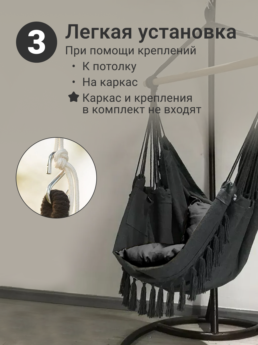 Изделие легко крепится на одну точку подвеса(к потолку либо на каркас), изготовлено из прочного 100% хлопка.
