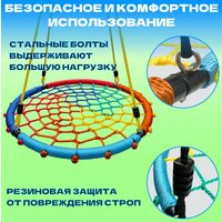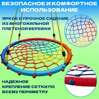 Подвесные круглые качели - это отличный выбор для детей и их родителей! Они изготовлены из прочного каркаса из нержавеющей стали и крепких многожильных тросов, которые не только обеспечивают долговечность и безопасность, но и делают их удобными для использования. Основание изготовлено из стальной трубы с толщиной стенки 1,8 мм, покрытой канатом, чтобы избежать неприятных ощущений от контакта с металлом. Плетеное из ярких и прочных нитей навесное сиденье равномерно и надежно закреплено по всему периметру круга и обладает высокой устойчивостью к истиранию. Благодаря качественным материалам и прочному металлическому каркасу, качельки выдерживают нагрузку до 200 кг, что делает их идеальным вариантом для семейного отдыха и игр в саду на даче как взрослым, так и детям. Они имеют регулируемую высоту от 110 до 180 сантиметров и могут быть использованы как в домашних условиях, так и на детской спортивной площадке на улице, а удобные фигурные кольца помогут в любой момент отрегулировать высоту канатов кресла. Дачные качели гнездо изготовлены из материалов, которые не боятся влаги, солнечного света и перепада температур, поэтому могут использоваться как уличные в любую погоду. Такая модель хороша тем, что в ней можно кататься в положении как лежа, так и сидя одному и группой из нескольких малышей. Изделие можно повесить в квартире: детской комнате, на балконе, веранде или в гостиной, а разборный каркас позволит при необходимости убрать их в шкаф или кладовую или взять с собой в поход, кемпинг, отдых на природе. Вы можете быть уверены, что ваш ребенок будет в безопасности, катаясь на этих садовых качелях во дворе. Если вы ищете качественные и безопасные игрушки для вашего ребенка, то качели гамак – отличный выбор! Садовая мебель не только удобна и долговечна, но и имеет стильный яркий дизайн, который понравится вашим детям. Купите их и наслаждайтесь веселым времяпрепровождением на свежем воздухе на своем уличном игровом комплексе! Карабин и петли для подвешивания в комплекте.
